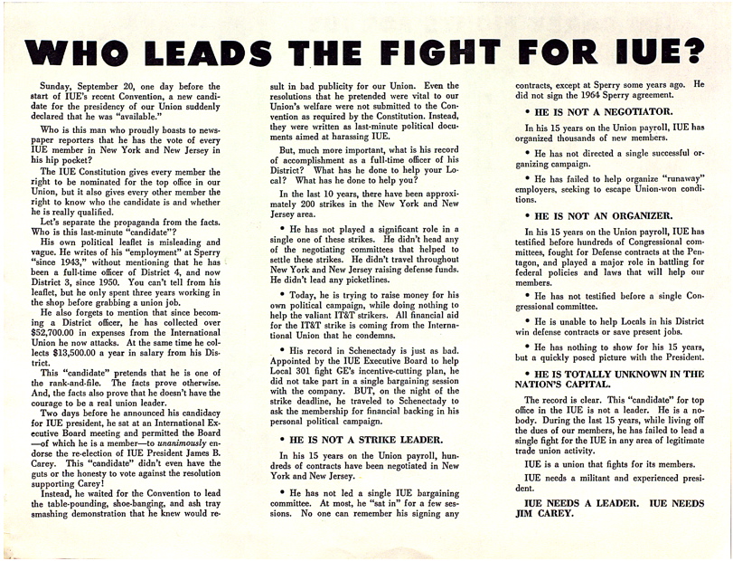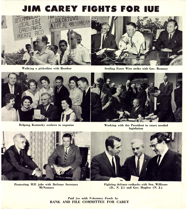 The following is a digital exhibition commemorating the life and career of the legendary labor leader and first president of the International Union of Electronic, Electrical, Salaried, Machine & Furniture Workers. The exhibition was co-curated in 2006 by Bob Golon, Labor Archivist with Special Collections and University Archives at Rutgers University Libraries; and Constance Finlay, Director of the James B. Carey Library at the School of Management and Labor Relations.