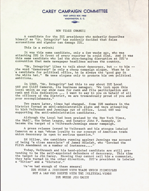 Title: Carey Campaign Committee flyer, "How Times Change"