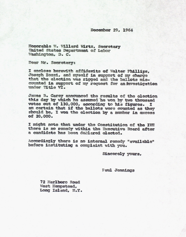 Description: Jennings writes the US Secretary of Labor regarding IUE AFL-CIO election fraud.
